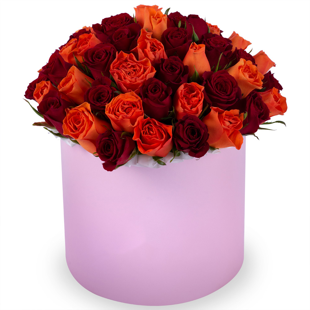 51 разноцветная роза в розовой шляпной коробке