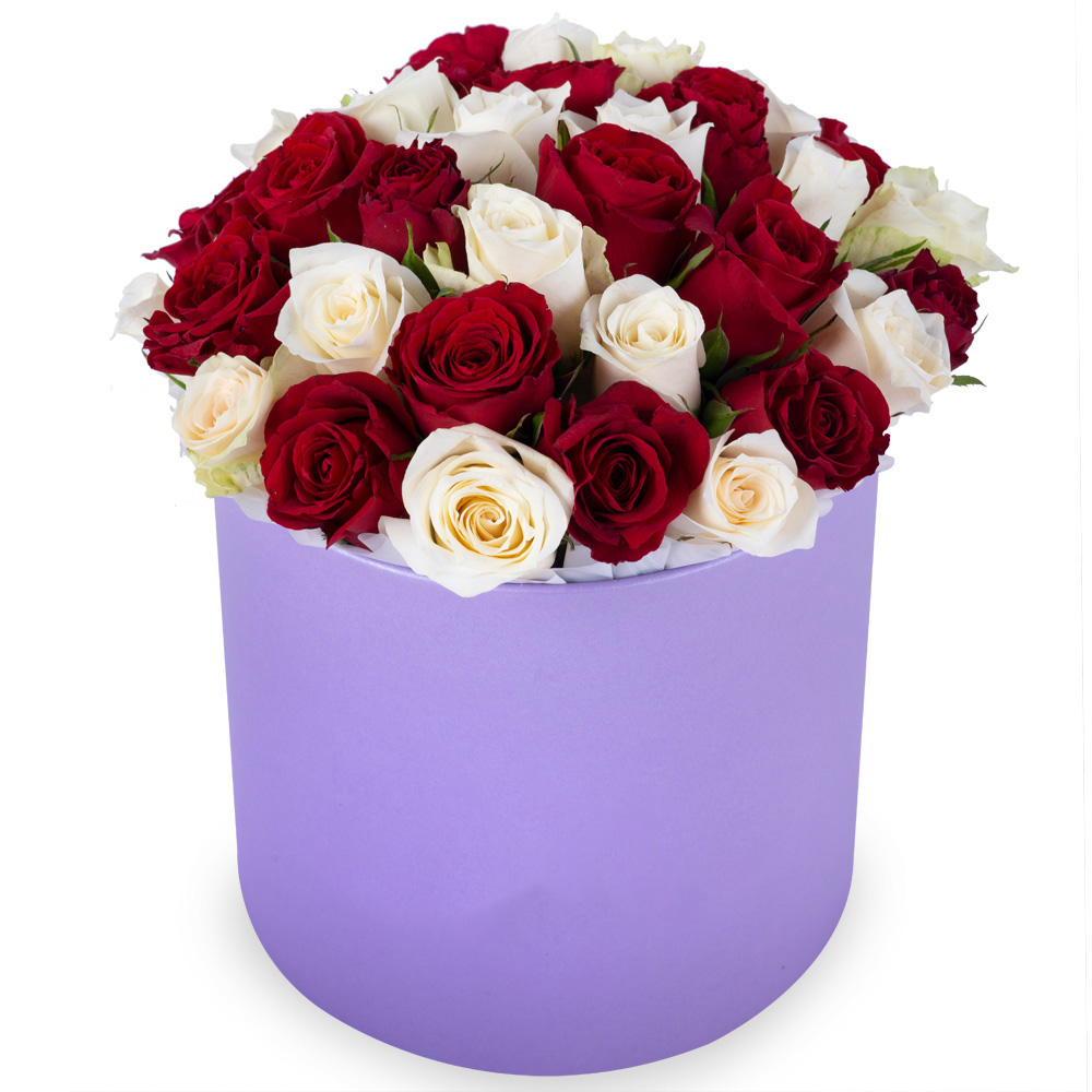 35 разноцветных роз в фиолетовой шляпной коробке