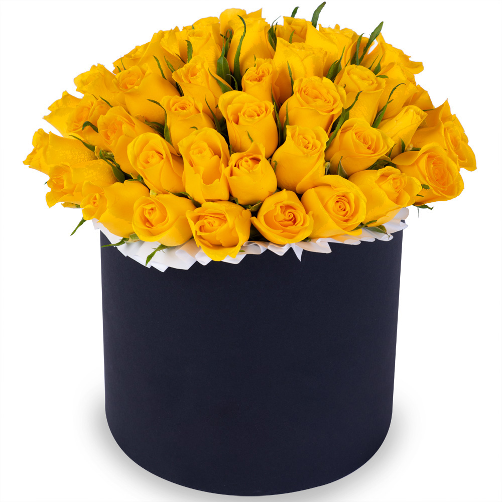 51 желтая роза в черной шляпной коробке