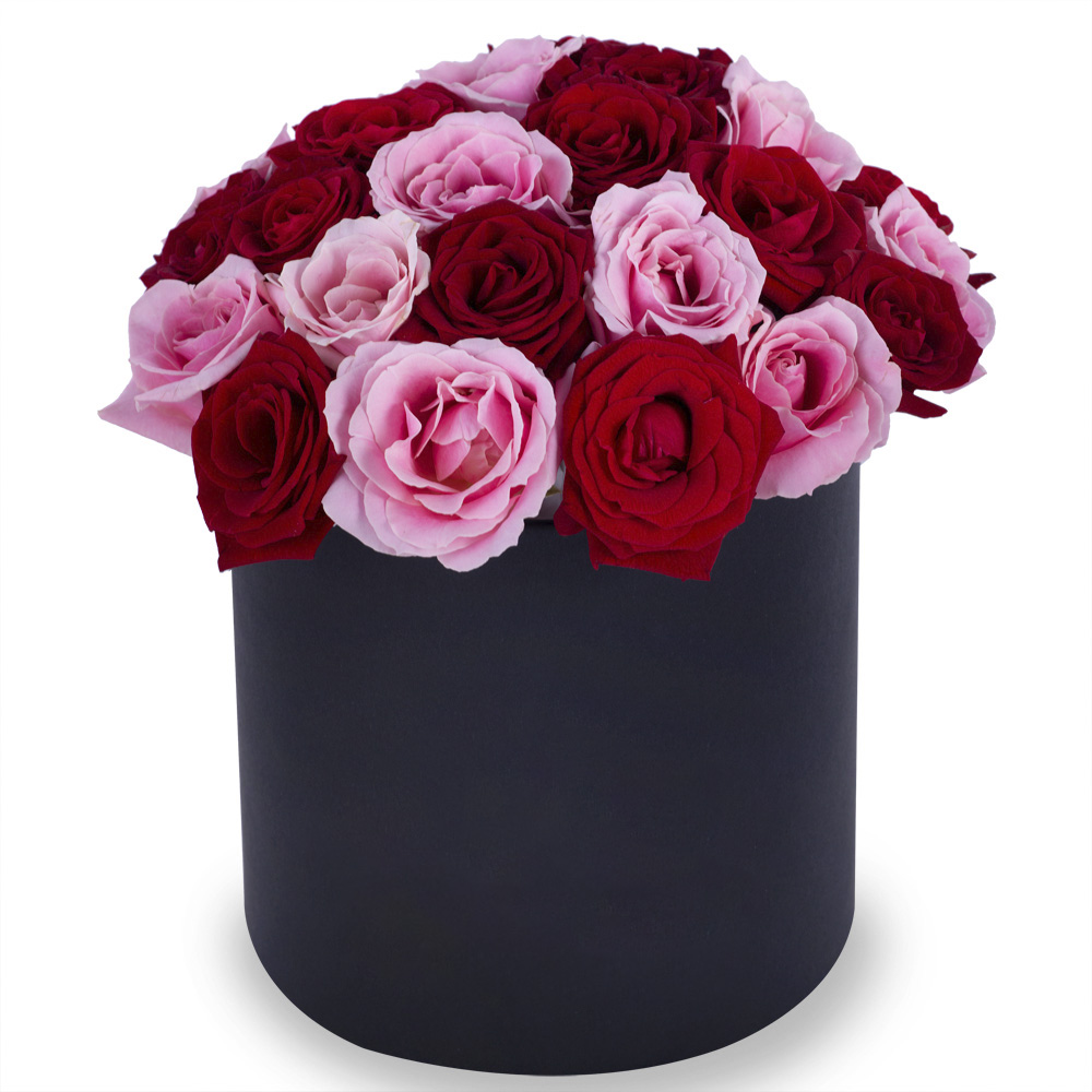 Букет из 35 разноцветных роз premium в черной шляпной коробке