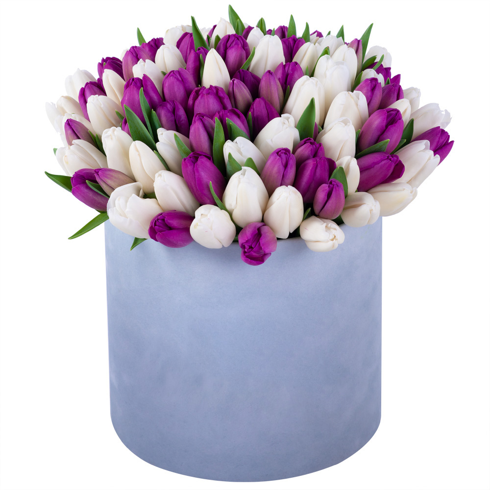 101 разноцветный тюльпан в серой бархатной шляпной коробке