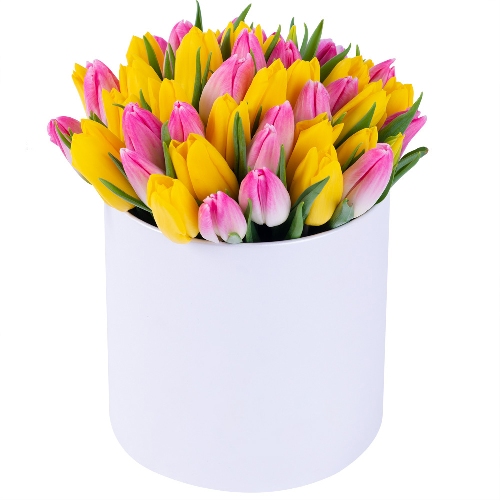 51 разноцветных тюльпан в белой шляпной коробке