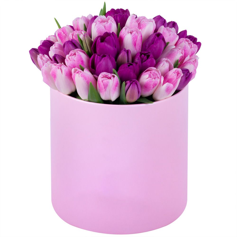 Разноцветный 51 тюльпан в розовой шляпной коробке