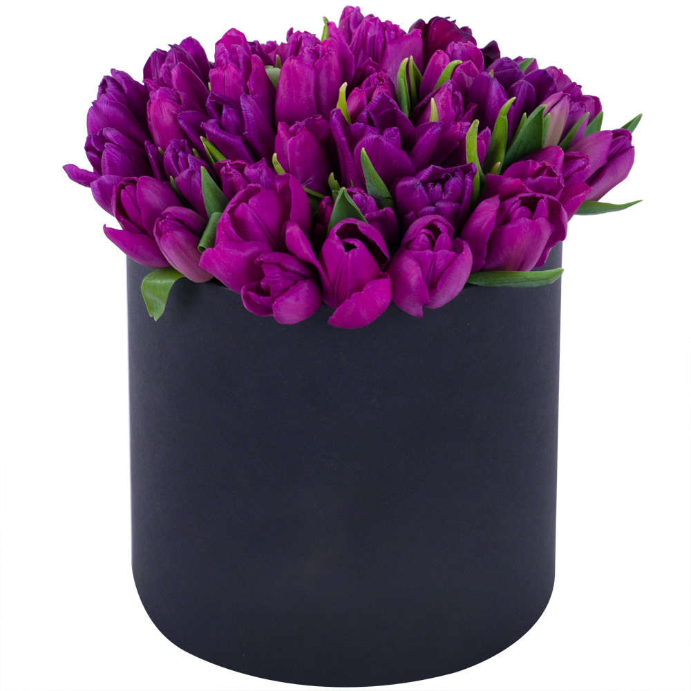 51 фиолетовый тюльпан в черной шляпной коробке