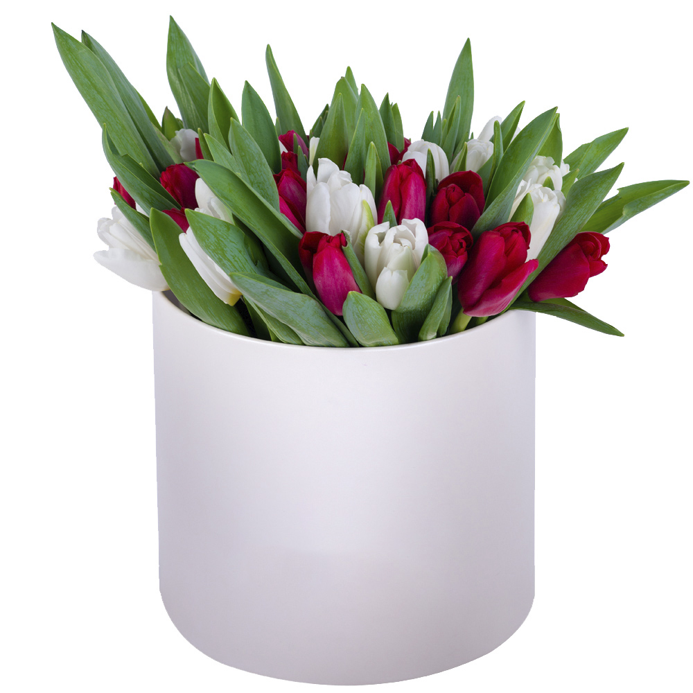51 Разноцветный тюльпан в кремовой шляпной коробке