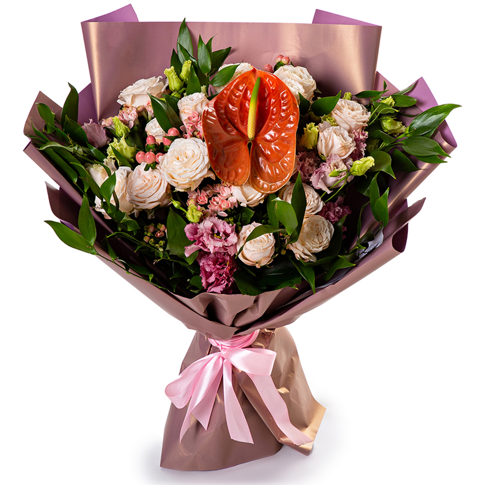 Букет с пионовидными розами и антуриумом