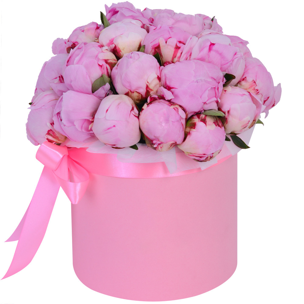 Букет из 25 розовых пионов в розовой шляпной коробке