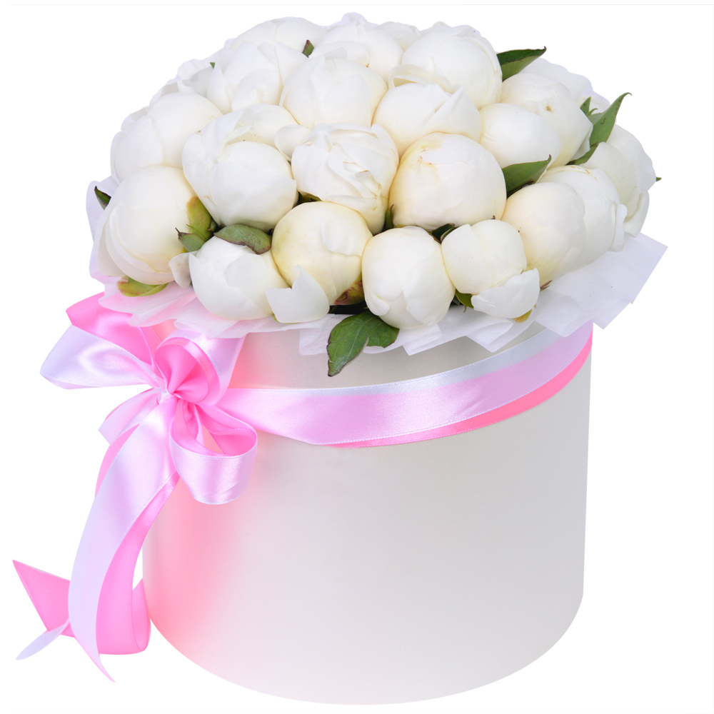 Букет из 35 белых пионов в кремовой шляпной коробке