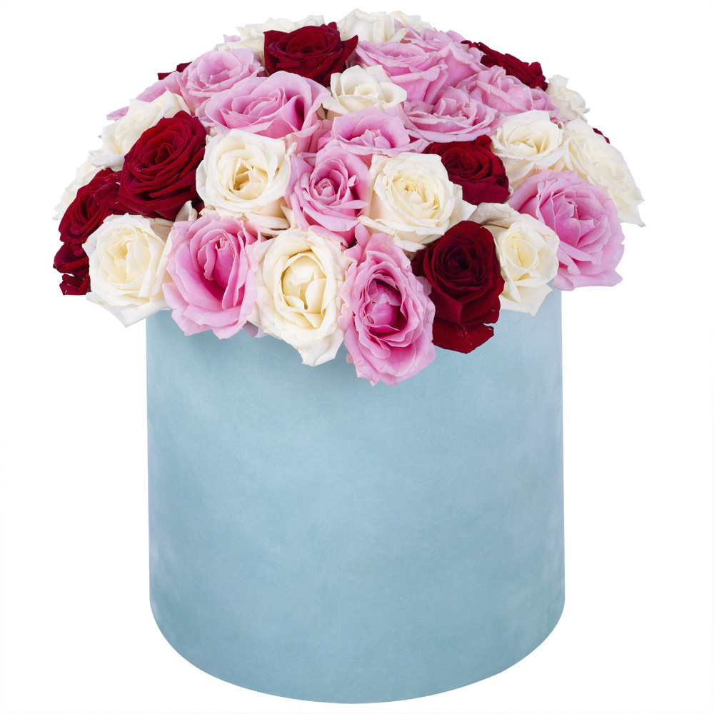 Букет из 51 разноцветной розы premium в бархатной шляпной коробке