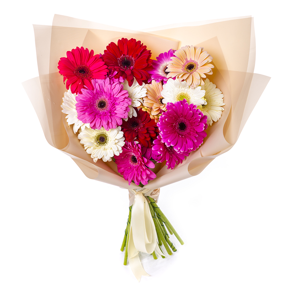 Букет из 25 разноцветных гербер в пленке