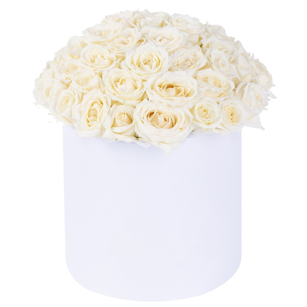 Букет из 51 белой розы premium в белой шляпной коробке