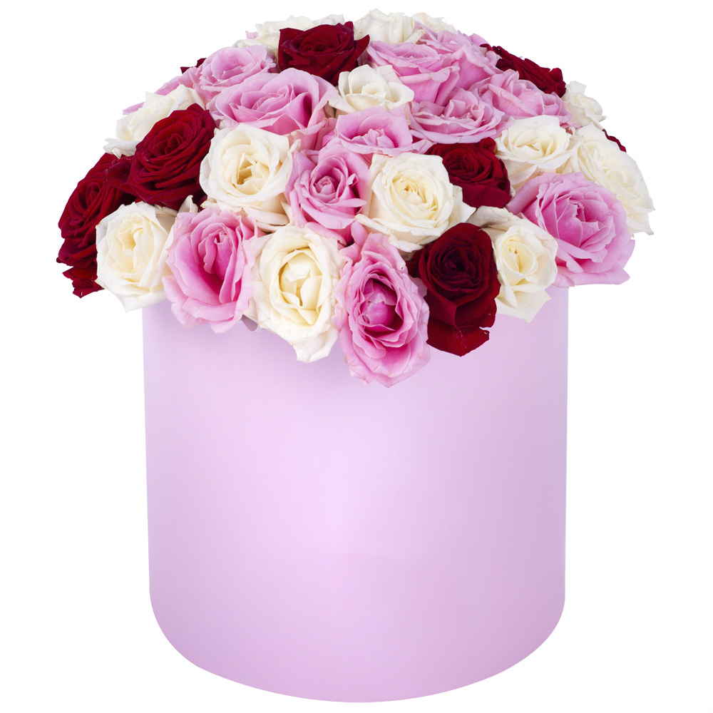 Букет из 51 разноцветной розы premium в розовой шляпной коробке