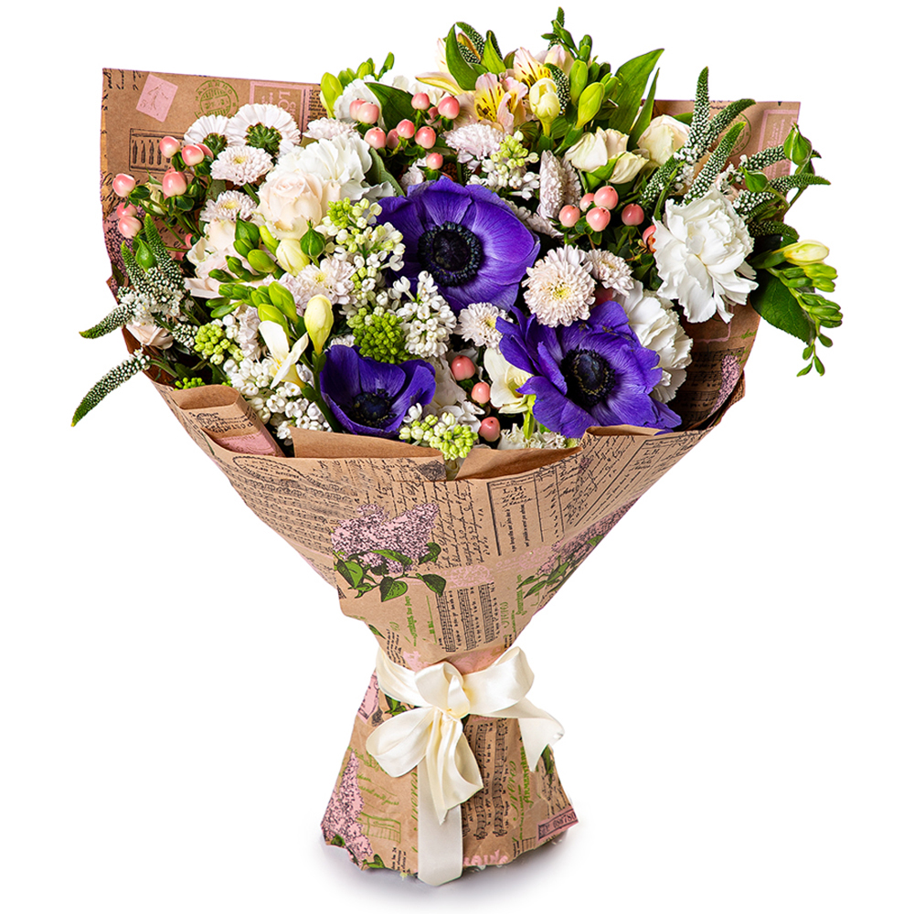 Букет из анемона, кустовой розы и сирени