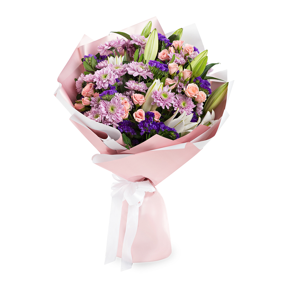 Букет из лилий, хризантем, фисташек и роз
