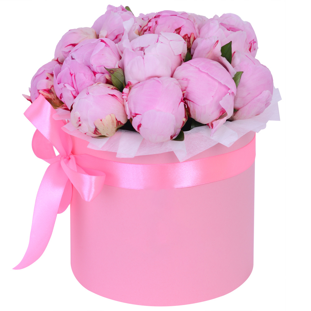 Букет из 15 розовых пионов в розовой шляпной коробке