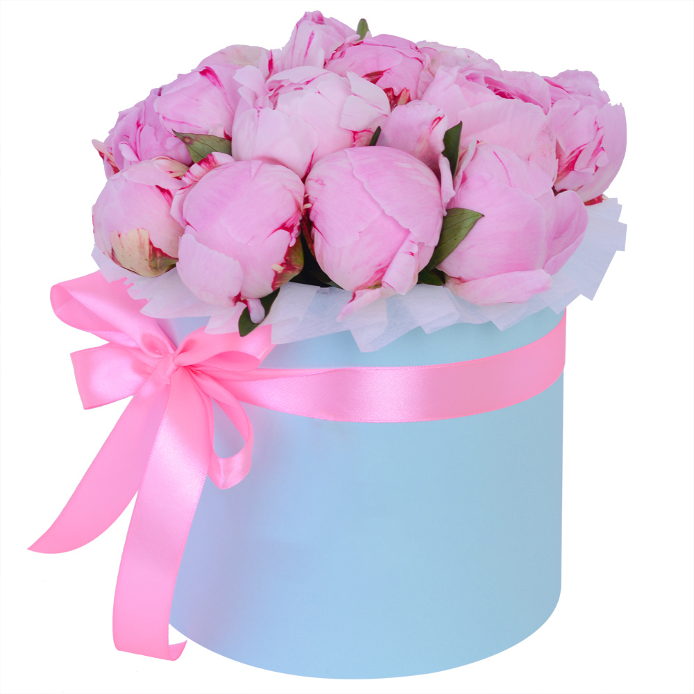 Букет из 15 розовых пионов в голубой шляпной коробке