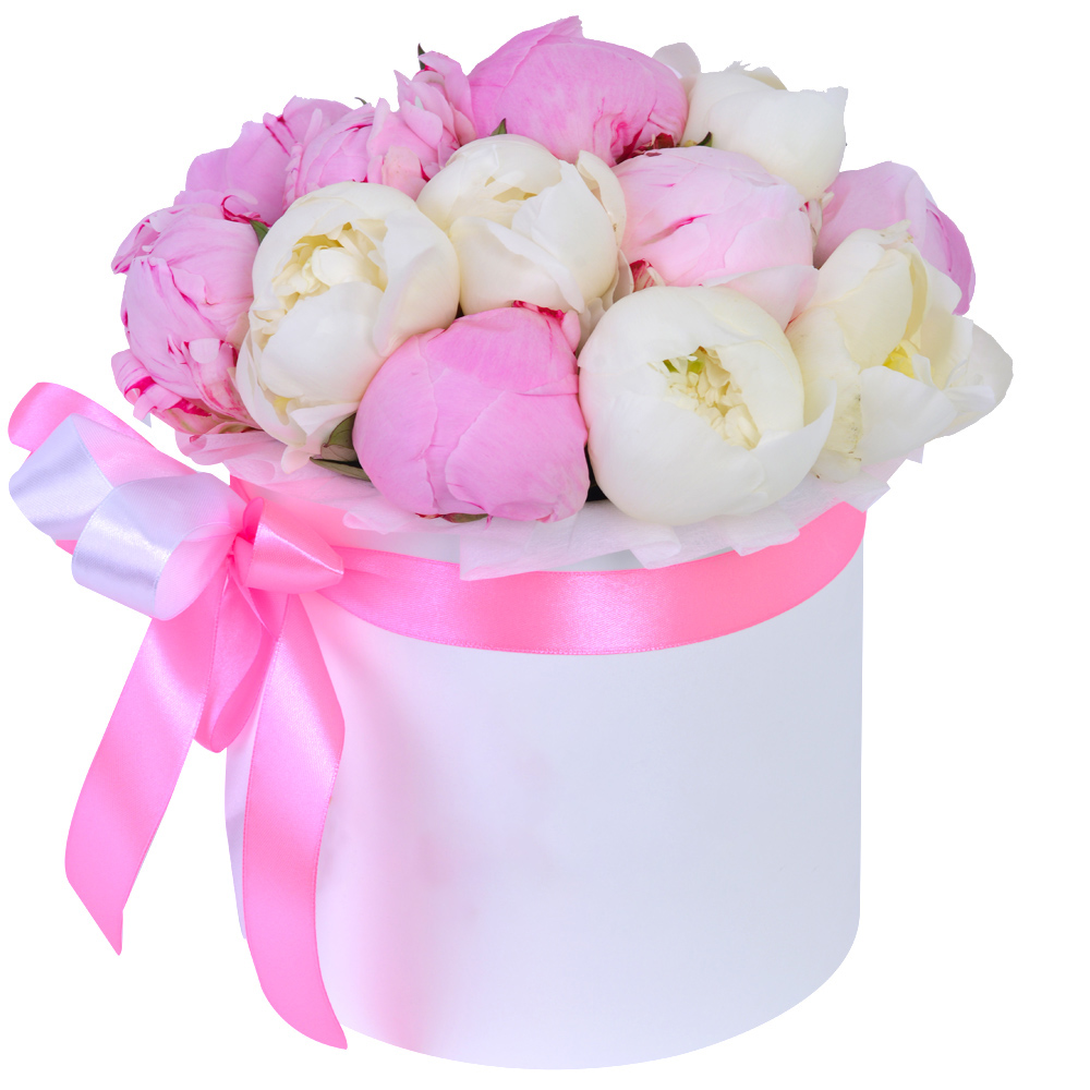 Букет из 11 разноцветных пионов в белой шляпной коробке