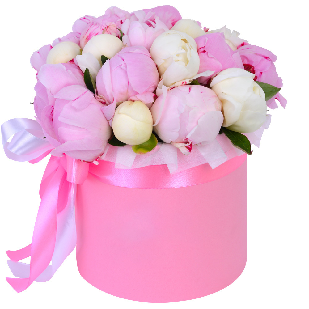 Букет из 19 разноцветных пионов в розовой шляпной коробке