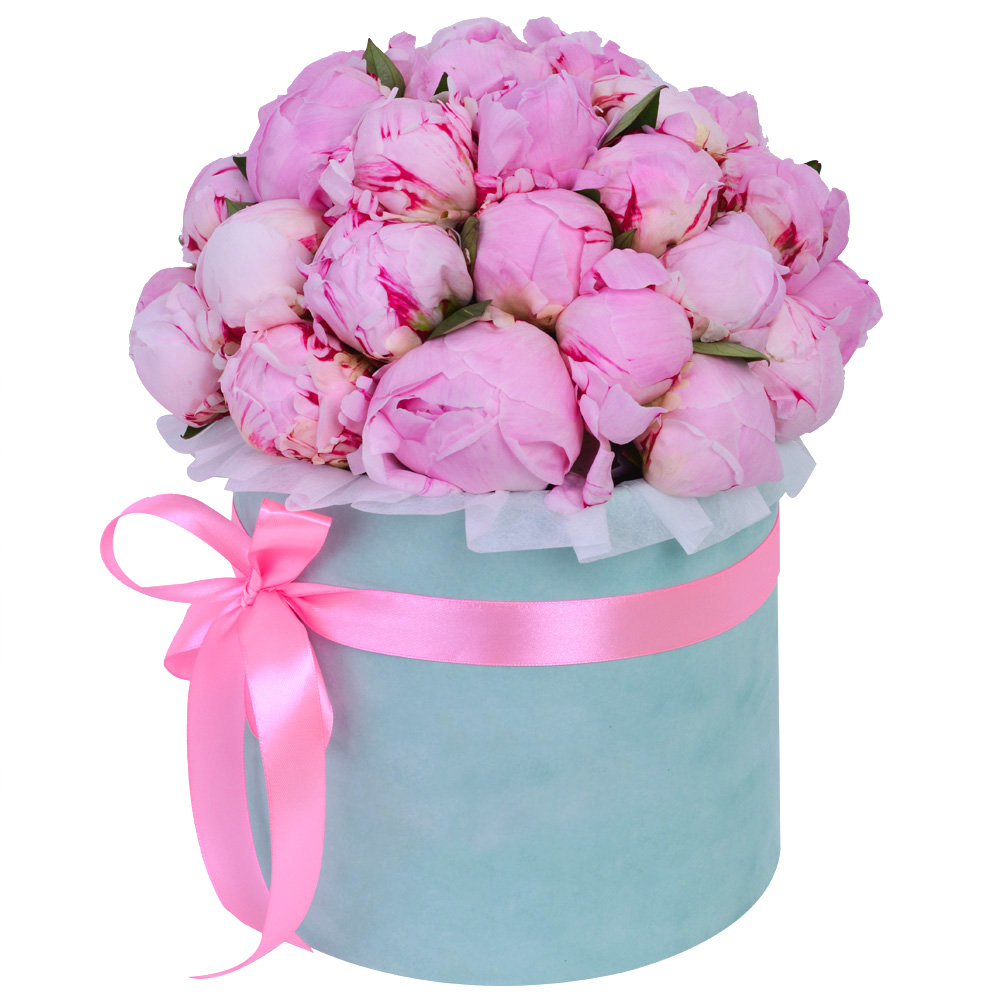 Букет из 35 розовых пионов в зеленой бархатной шляпной коробке