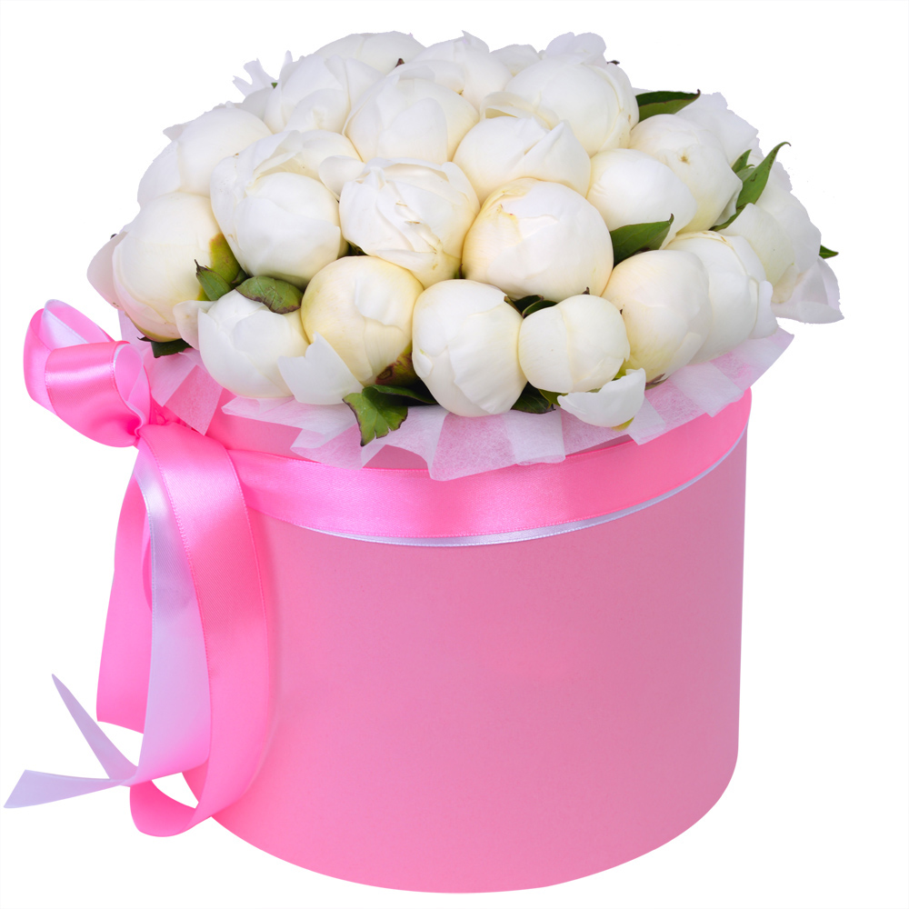 Букет из 35 белых пионов в розовой шляпной коробке