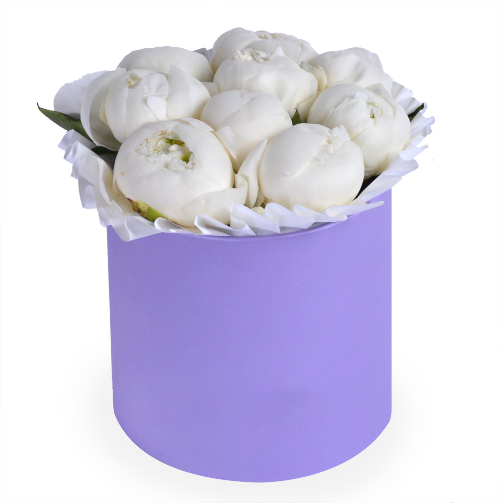 Букет из 9 белых пионов в фиолетовой шляпной коробке
