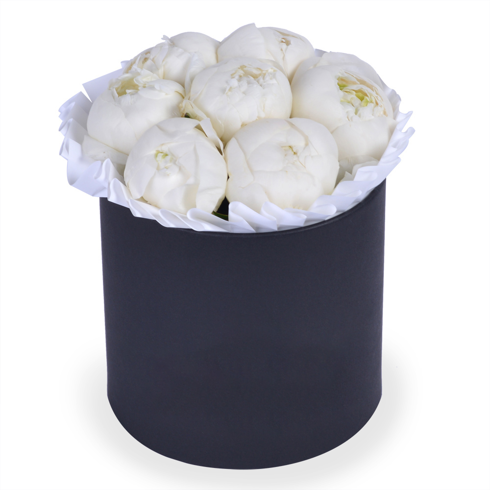 Букет из 9 белых пионов в черной коробке