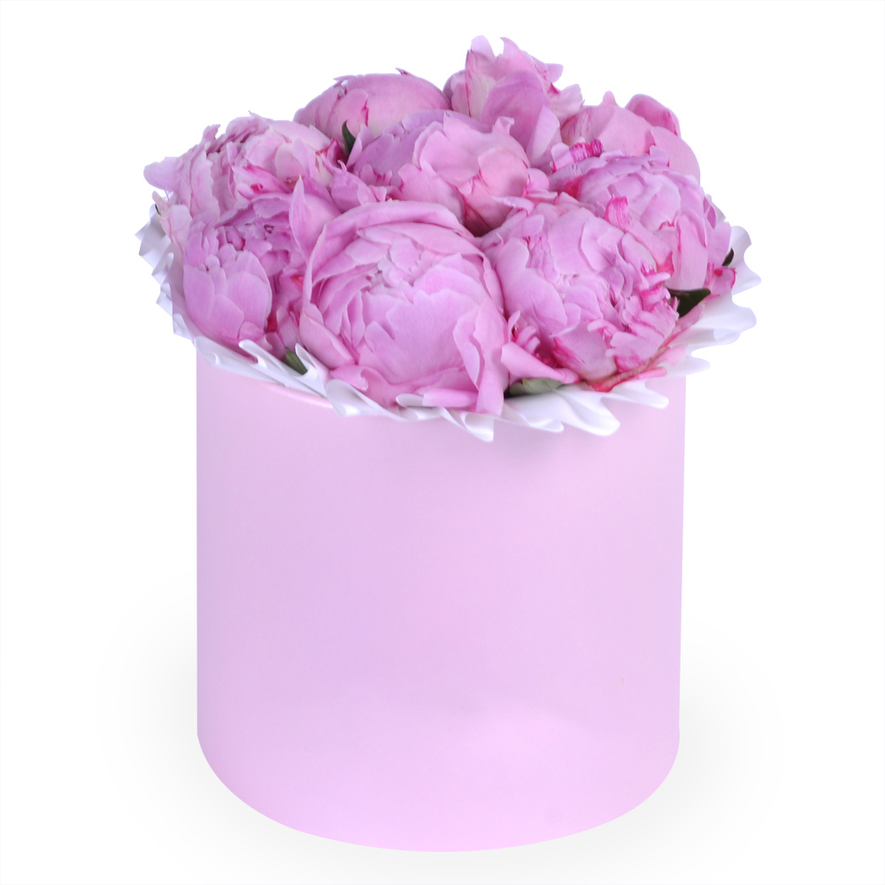 Букет из 9 розовых пионов в розовой шляпной коробке