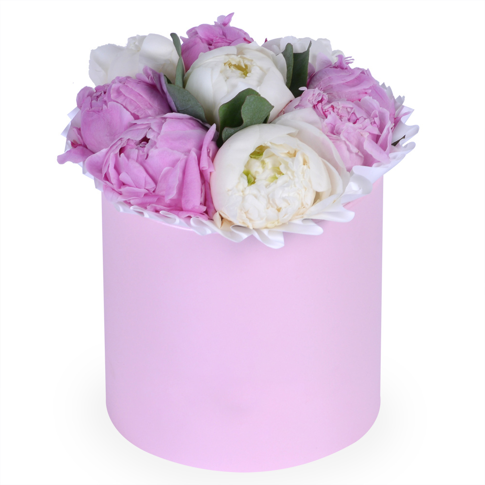 Букет из 9 разноцветных пионов в шляпной коробке с эвкалиптом