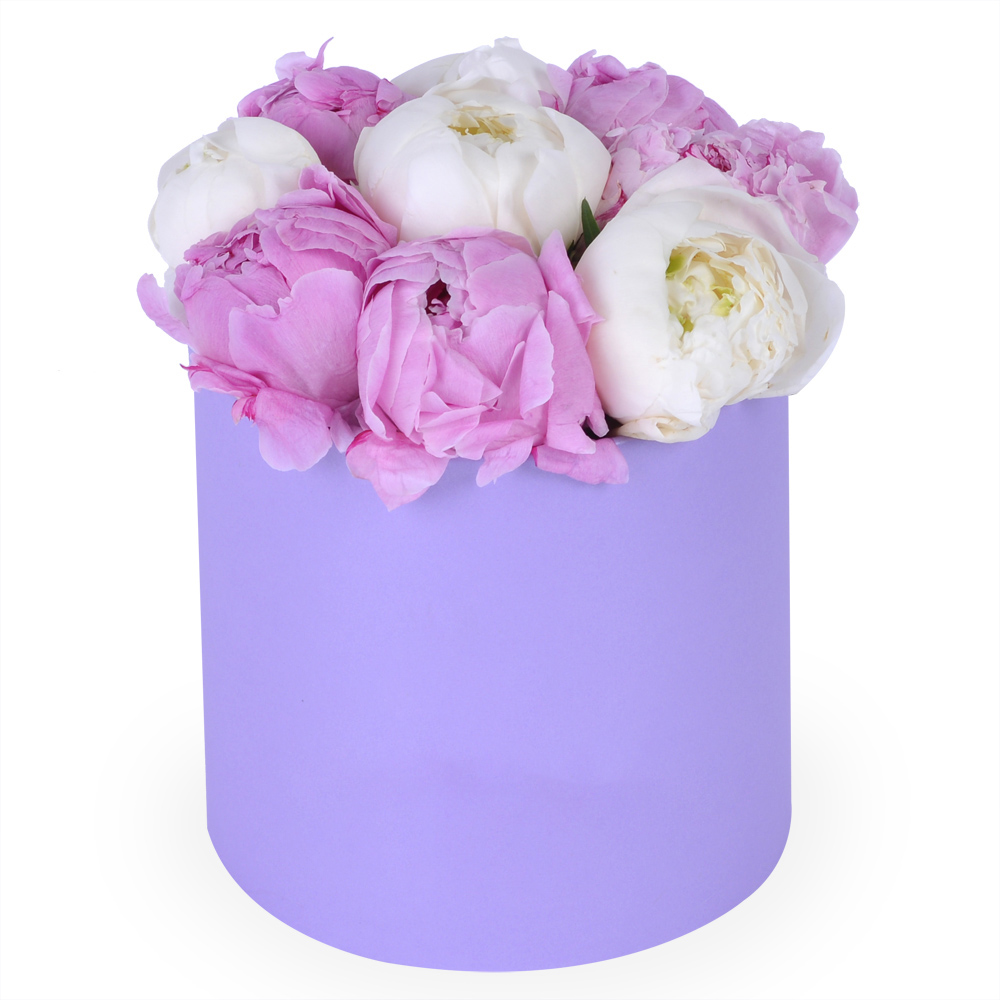 Букет из 9 разноцветных пионов в фиолетовой шляпной коробке