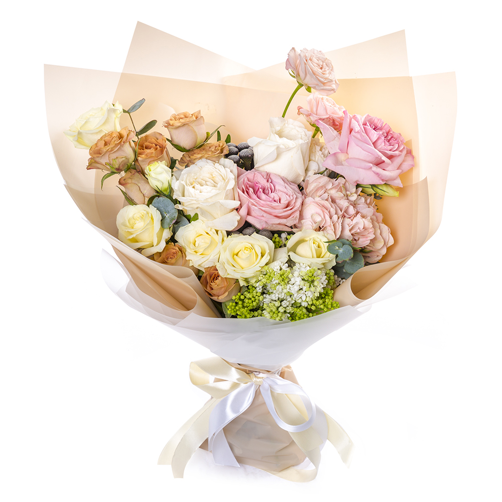 Букет с разноцветными розами и сиренью