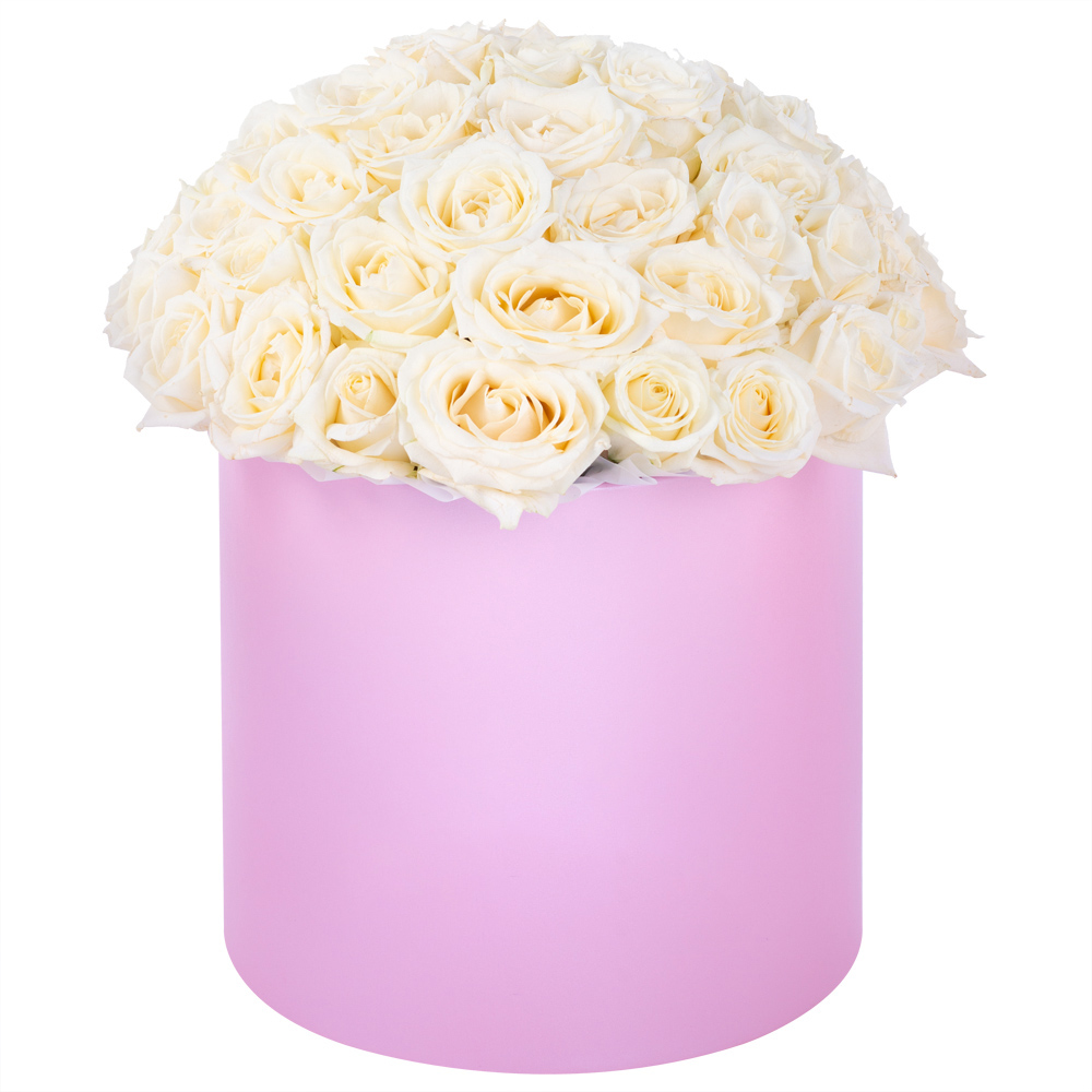Букет из 51 белой розы premium в розовой шляпной коробке