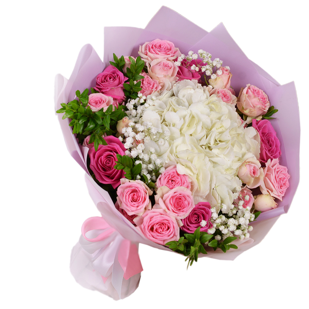 Букет из гортензии, гипсофилы и роз