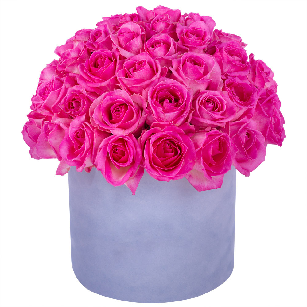 Букет из 51 малиновой розы premium в серой бархатной шляпной коробке