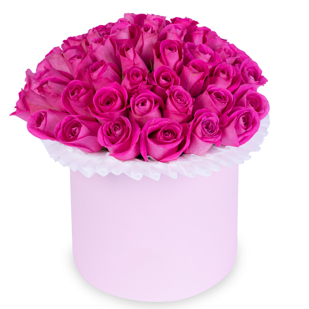 Букет из 35 розовых роз в розовой шляпной коробке