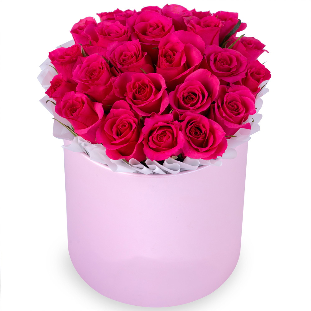 25 малиновых роз в розовой шляпной коробке