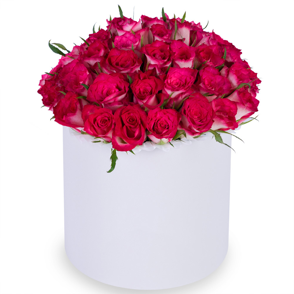 Букет из 51 бело-малиновой розы в белой шляпной коробке