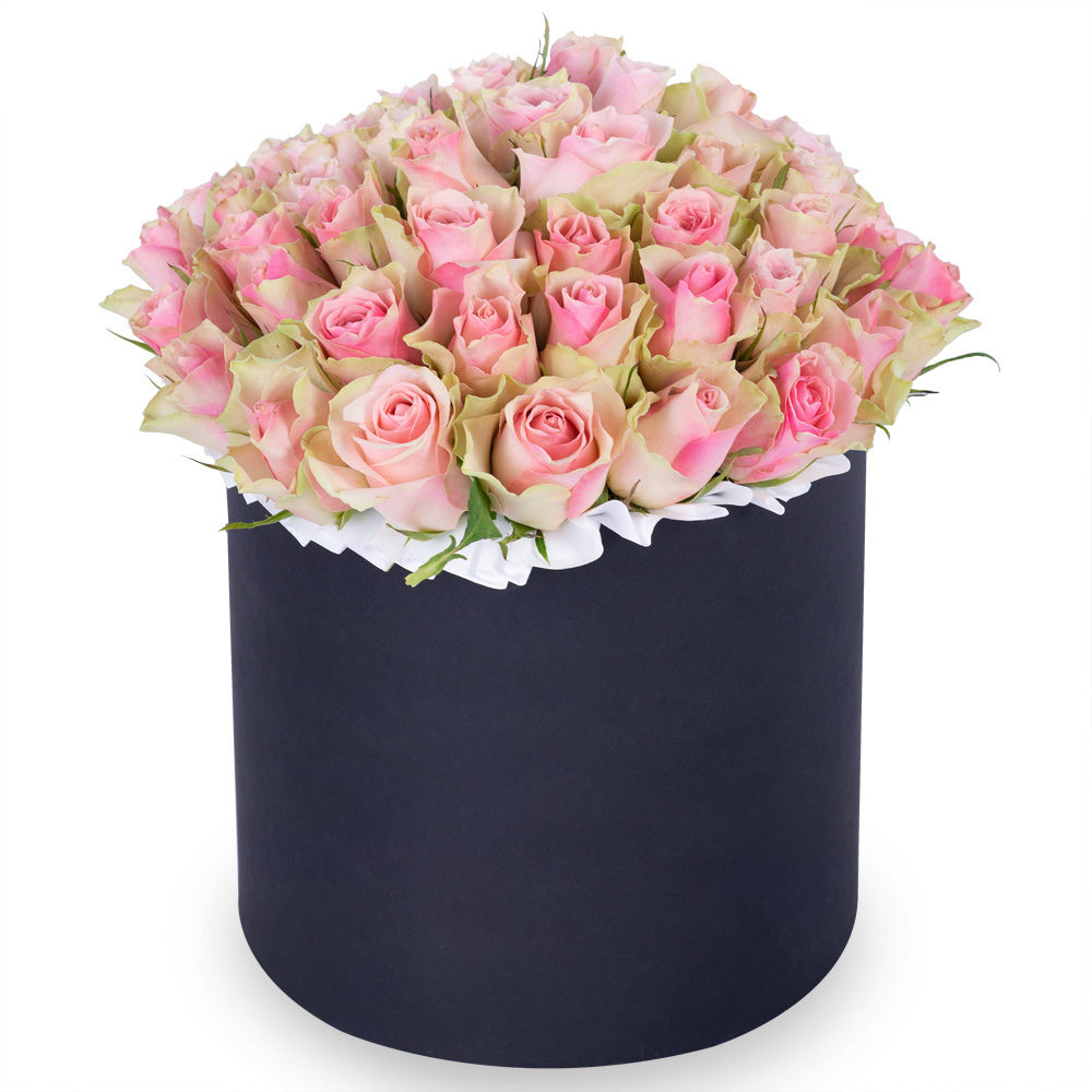 Букет из 75 бело-розовых роз в черной шляпной коробке