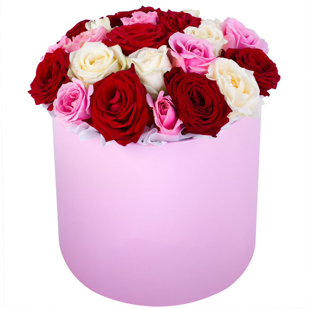Букет из 21 разноцветной розы premium в розовой шляпной коробке