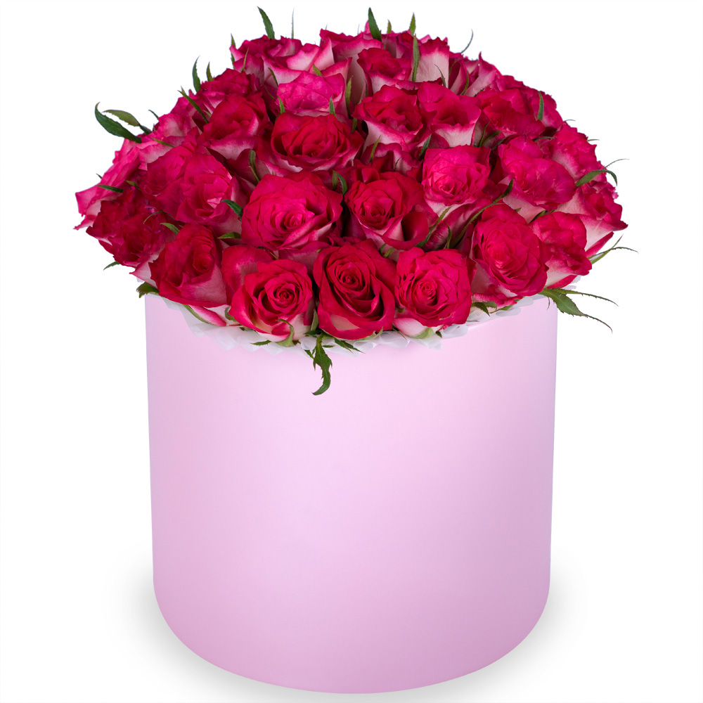 Букет из 51 бело-малиновой розы в розовой шляпной коробке