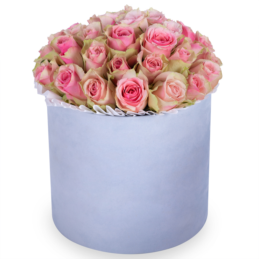 Букет из 25 бело-розовых роз в серой бархатной шляпной коробке