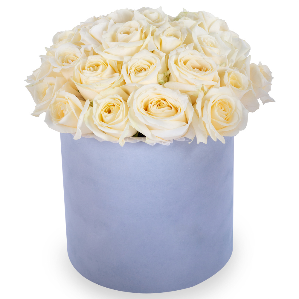 Букет из 35 белых роз premium в серой бархатной шляпной коробке