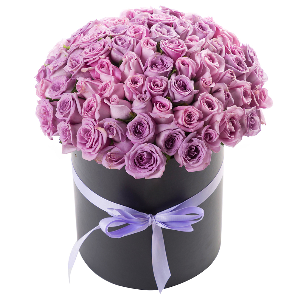 101 сиреневая роза в шляпной коробке