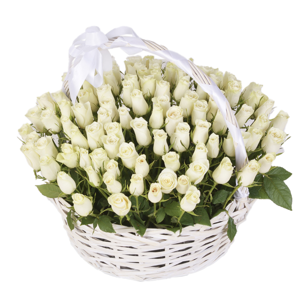 101 белая роза в корзине