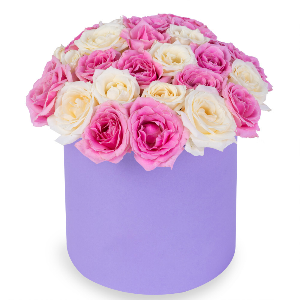25 разноцветных роз premium в фиолетовой шляпной коробке