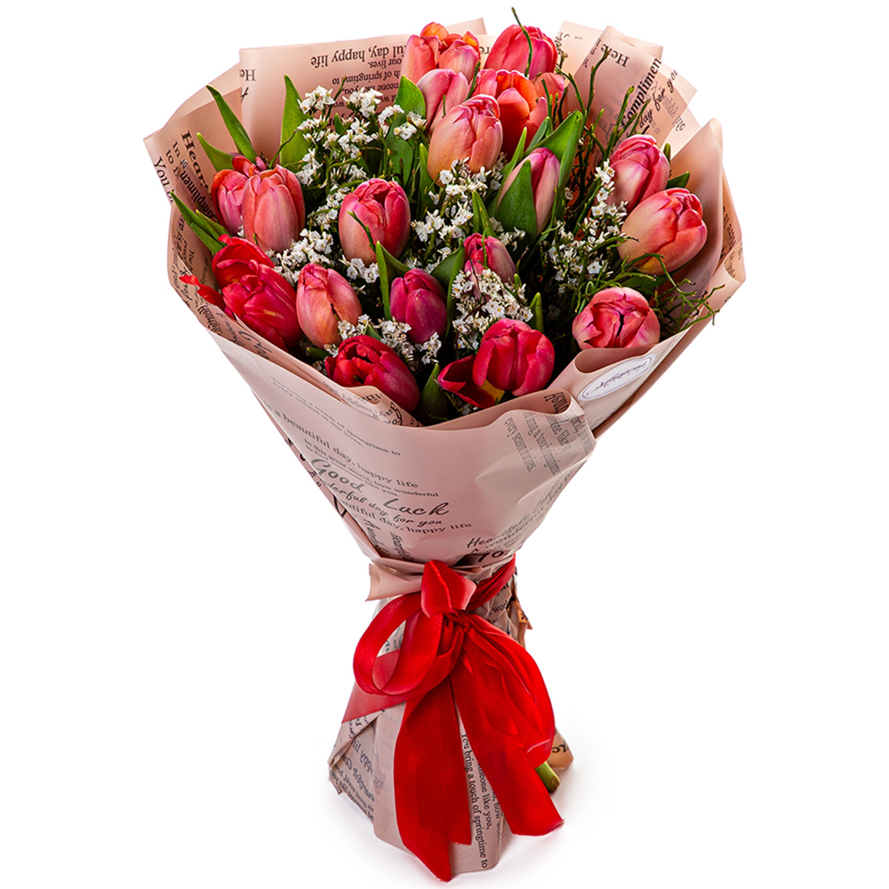 Букет из 19 розовых тюльпанов с лимониумом