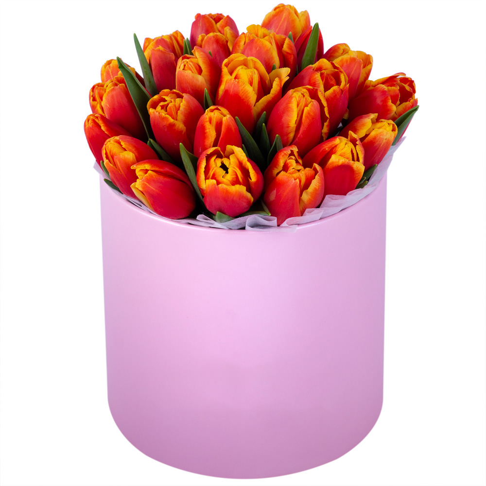 25 огненных тюльпан в розовой шляпной коробке