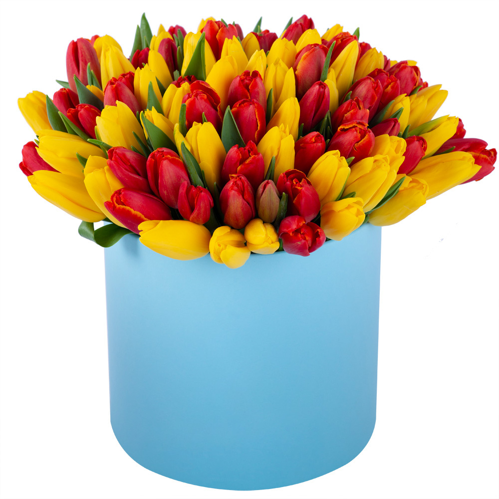 Букет из 101 разноцветного тюльпана в голубой шляпной коробке
