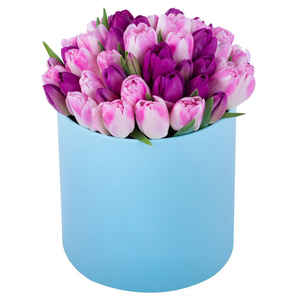 Разноцветный 51 тюльпан в голубой шляпной коробке