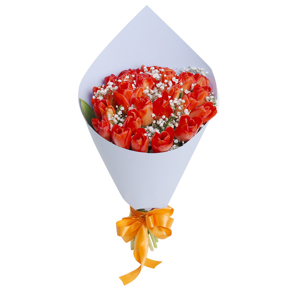 Букет из 25 оранжевых тюльпанов с гипсофилой