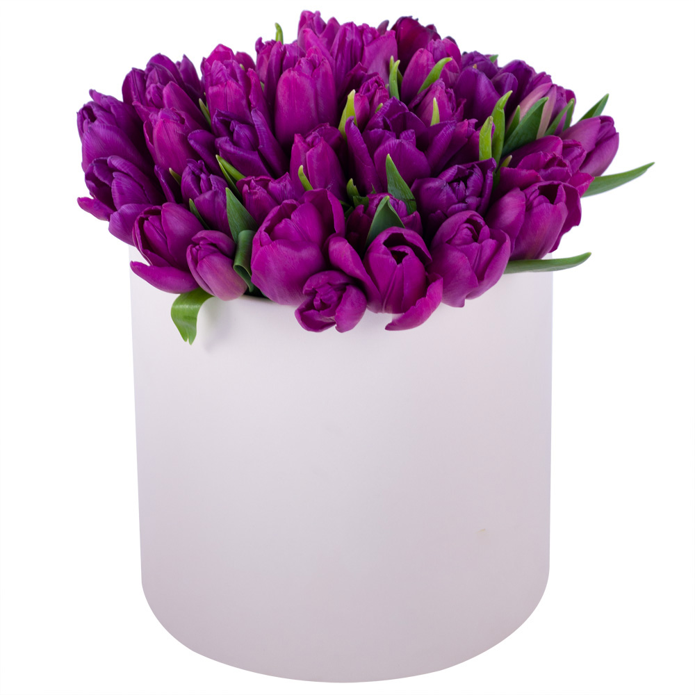51 фиолетовый тюльпан в кремовой шляпной коробке